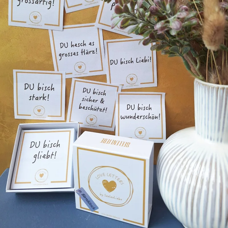 Art.-Nr.: 1450767 CHF / Stk. inkl. MwSt. 22.00 Anzahl (Stk.): Stk. Produktbeschreibung 50 Kleine Liebesbrief Botschaften in Berndeutsch Böxli mit kleinen Goldherzli Gröss 8.5 x 8.5 x 3 cm Lieferbar innert 3-5 Arbeitstagen